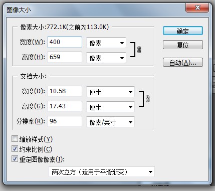 (注:如果所要批處理的圖片高寬不等此方法會讓圖片變形??捎谩皥D像—圖像大小”設(shè)置高或?qū)捜我粋€數(shù)值,輸入一個值即可,勾選“約束比例”,而這個方法需要所有要處理的圖片有一個(高或?qū)挘┍匦枰恢碌闹祵傩浴TO(shè)定共同值后,會按各圖片的比例縮放,不會讓圖片變形。)。