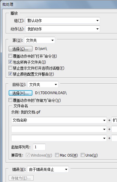 然后就是使用批處理命令,達(dá)到一步到位的效果了先做準(zhǔn)備工作:把所有待處理的圖片放到一個文件夾里,新建一個文件夾用來放置處理過的圖片。執(zhí)行“文件→自動→批處理”打開批處理命令框。接著設(shè)置各個參數(shù)和選項。1. 在“動作”下拉菜單中選擇“我的動作”。2. 在“源”下拉菜單中選擇“文件夾”。3. 單擊[選取]按鈕在彈出的對話框中選擇待處理的圖片所在的文件夾,單擊[確定]。單擊選中“包含所有子文件夾”和“禁止顏色配置警告”這兩個復(fù)選框。4. 在“目的”下拉菜單中選擇“文件夾”,單擊[選擇]按鈕,在彈出的對話框中選擇準(zhǔn)備放置處理好的圖片的文件夾,單擊[確定]。5. 在“文件命名”的第一個框的下拉菜單中選擇“1位數(shù)序號”,在第二個框的下拉菜單中選擇“擴(kuò)展名(小寫)”。6.在“錯誤”下拉菜單中選擇“將錯誤記錄到文件”,單擊[另存為]選擇一個文件夾。批處理若中途出了問題,計算機會忠實地記錄錯誤的細(xì)節(jié),并以記事本存于選好的文件夾中。這一切做好,檢查無誤之后,單擊[好],計算機就會開始一張一張地打開處理和保存那些我們選中的圖片,直到任務(wù)結(jié)束。